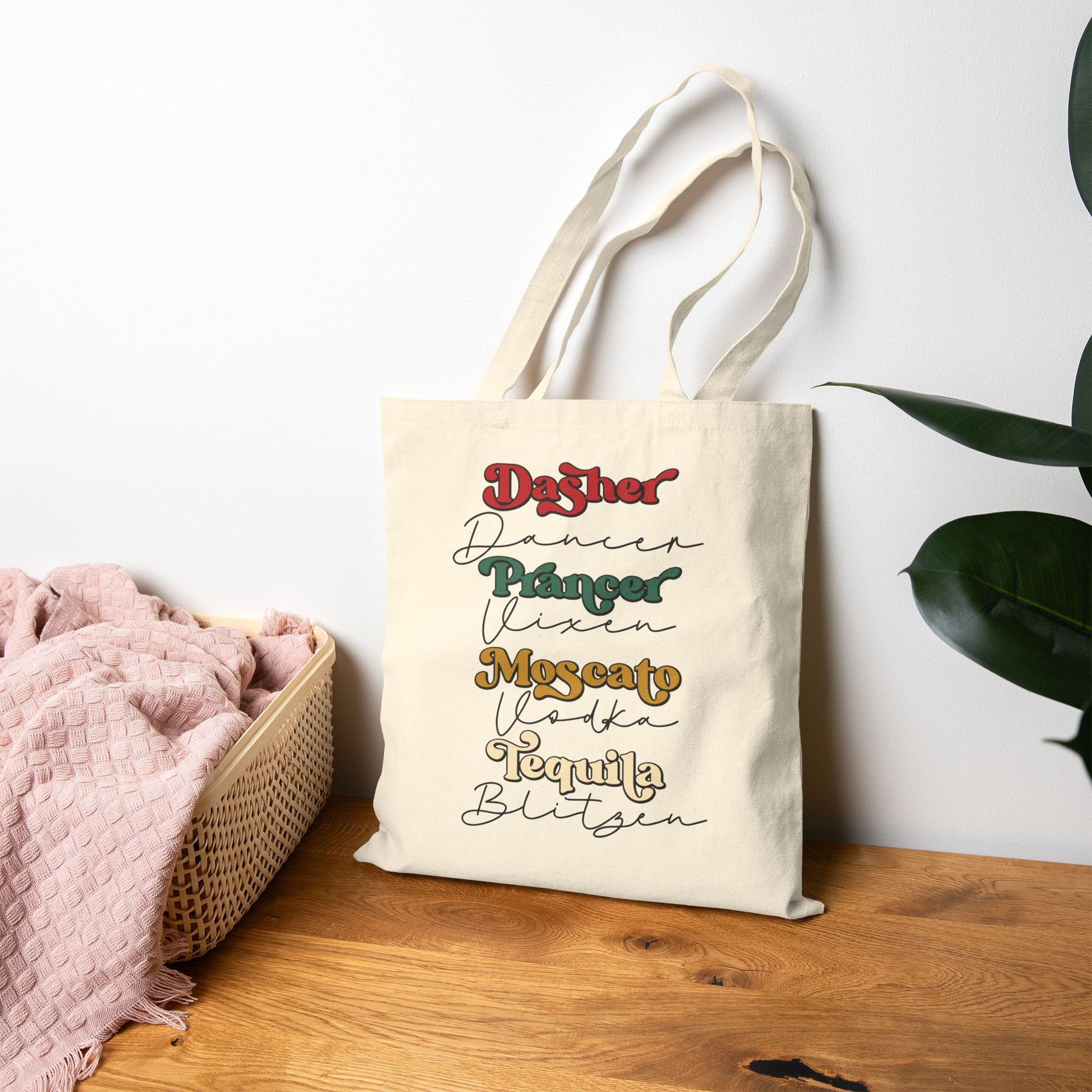 Holiday errands never looked so fun. This sturdy cotton canvas tote features the cheeky lineup “Dasher, Prancer, Moscato, Tequila” in festive vintage lettering — clean, bold, and guaranteed to get a laugh in the checkout line. The flat-corner construction and heavyweight fabric make it perfect for wine runs, gift shopping, library hauls, or holding all the things you swear you’re not going to forget this time.