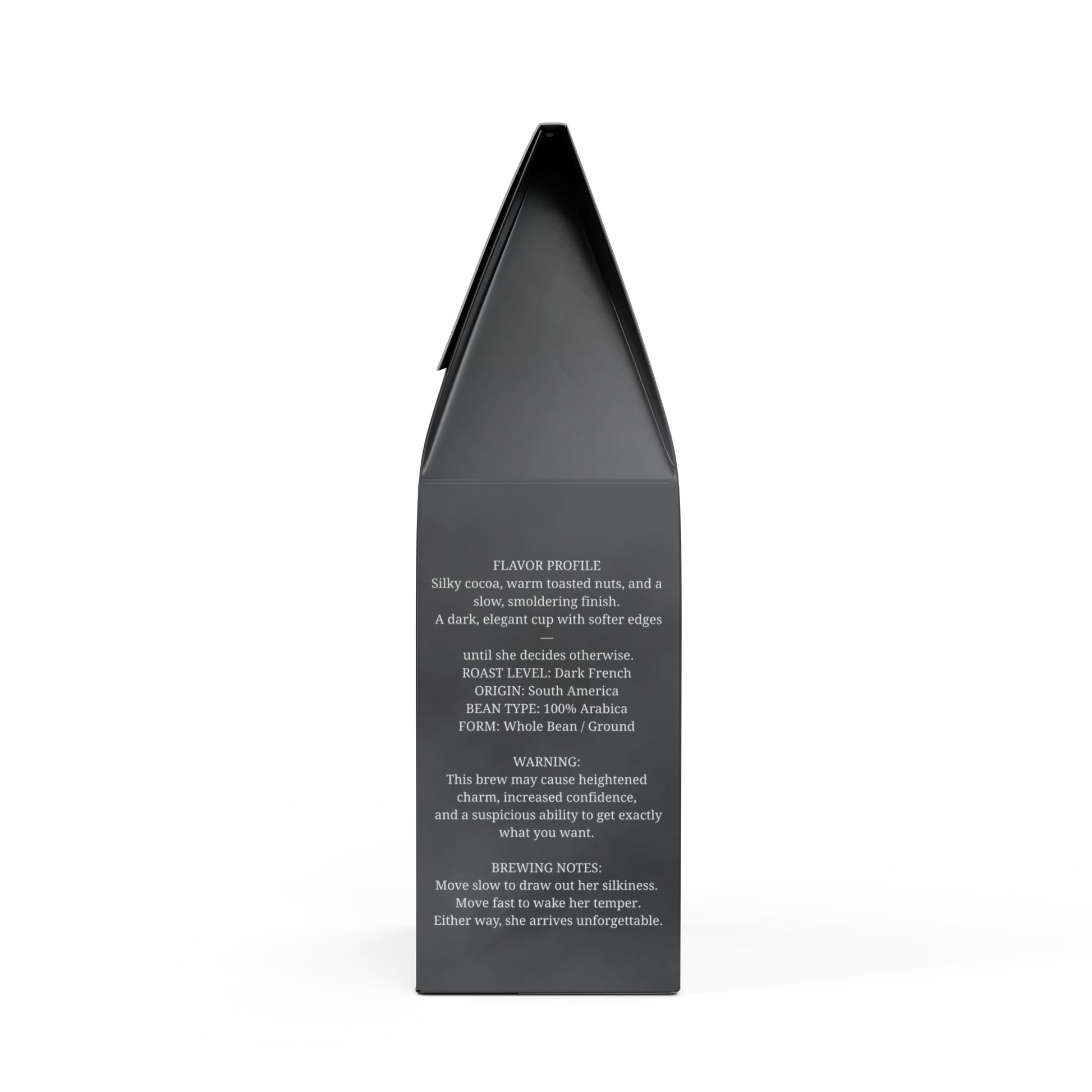 Small-batch roasted in the USA from South American specialty-grade beans, she’s smooth, decadent, and elegantly bold. This is the kind of coffee that wears red lipstick, holds eye contact too long, and always leaves a little mystery behind.