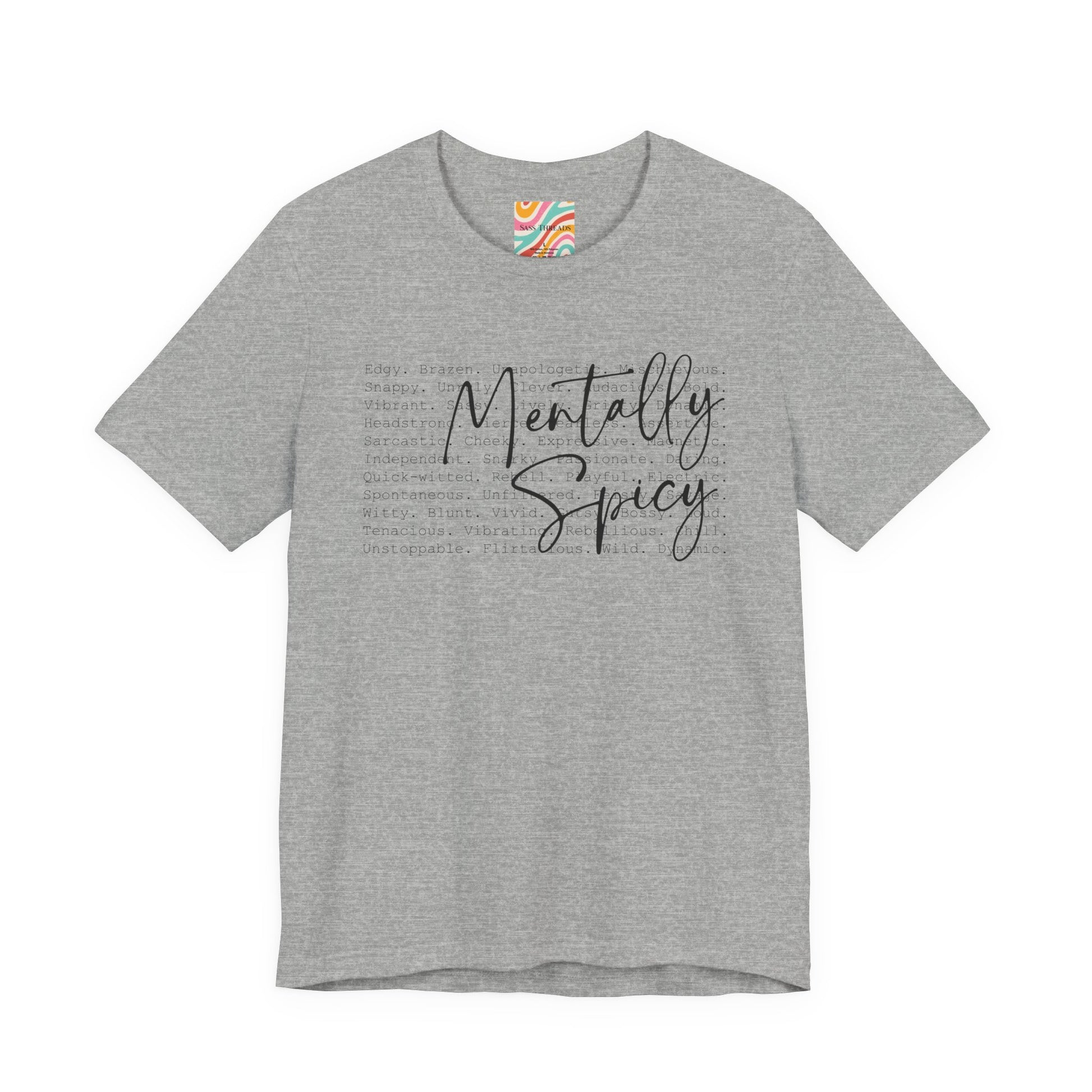 Introducing our Unisex Jersey Short Sleeve Tee, the perfect blend of comfort and style. This tee is designed to bring a lighthearted twist to your wardrobe with its fun "Mentally Spicy" graphic, making it an ideal choice for those who love to express their personality through fashion. Whether you're lounging at home, heading out with friends, or attending casual gatherings, this tee effortlessly adapts to your lifestyle and helps you create a relaxed, cheerful atmosphere. It's a great pick for gifted individuals during celebrations like birthdays, casual get-togethers, and even themed parties. Perfect for anyone who appreciates a humorous take on daily life, this shirt is a must-have for both men and women alike.