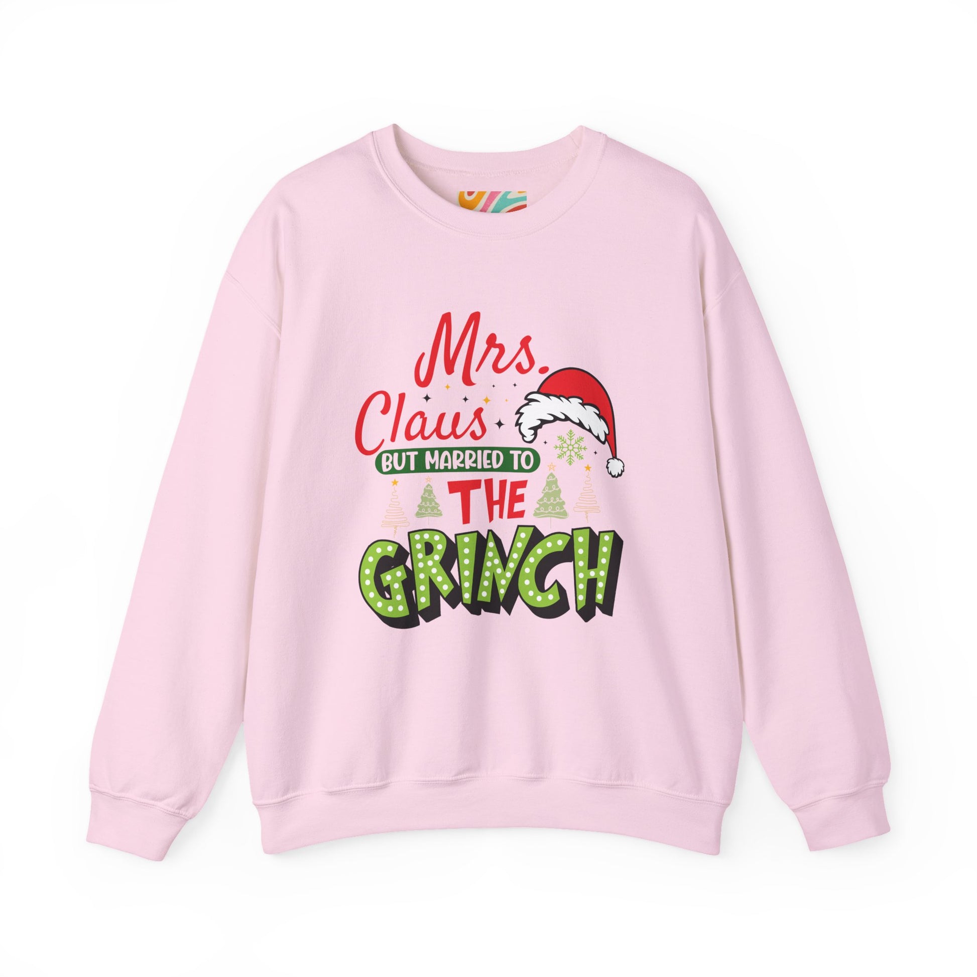 This ultra-soft crewneck blends cozy comfort with unapologetic holiday humor. The playful design says âMrs. Claus but married to the Grinchâ in bright, festive lettering topped with a cheeky Santa hat â perfect for every woman whoâs decking the halls while her partner mutters about electricity bills.