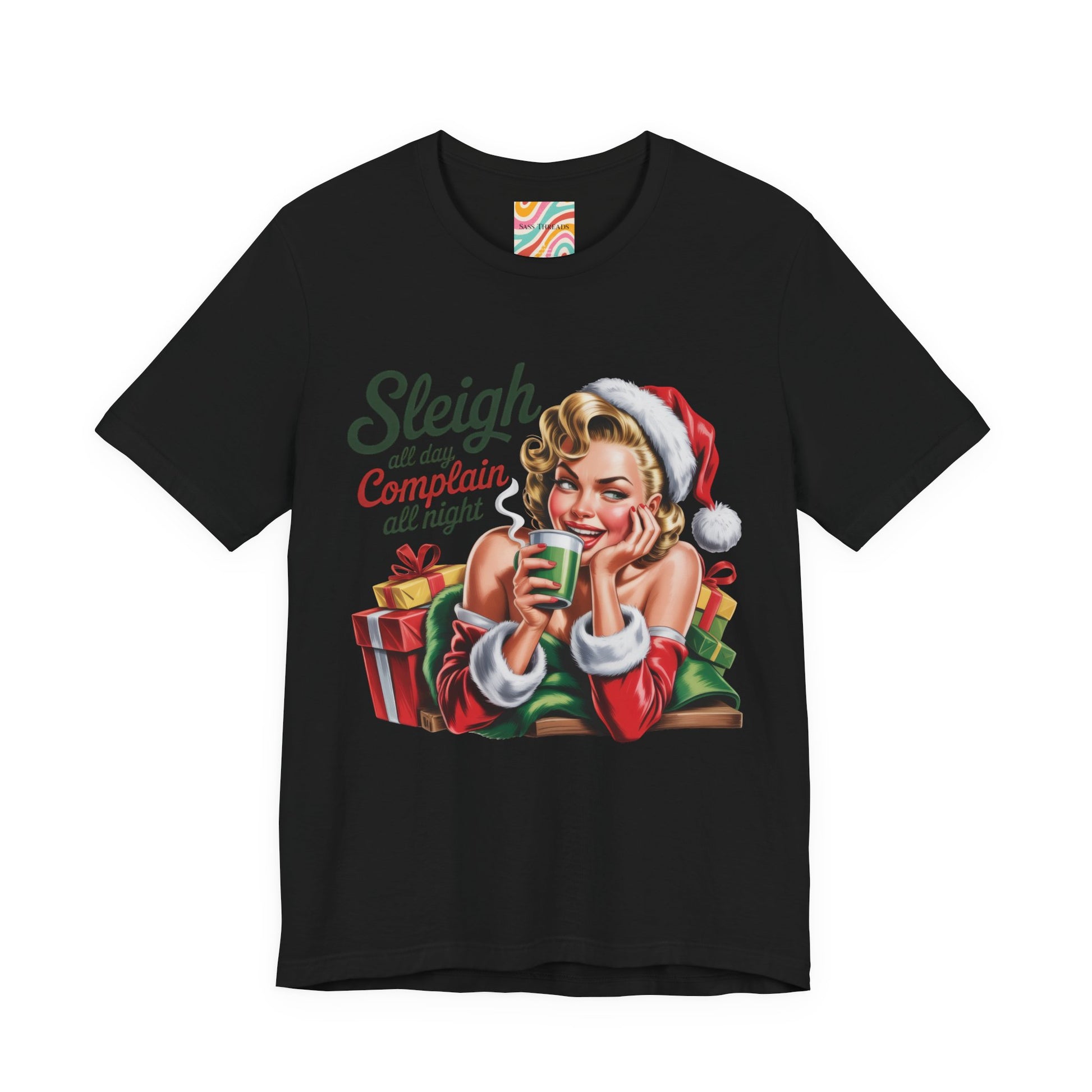 This ultra-soft tee features a classic pin-up Santa babe smirking over her cup of âholiday survival fuel,â paired with the line âSleigh all day, complain all night.â Itâs festive, funny, and brutally honest â just like your group chat.