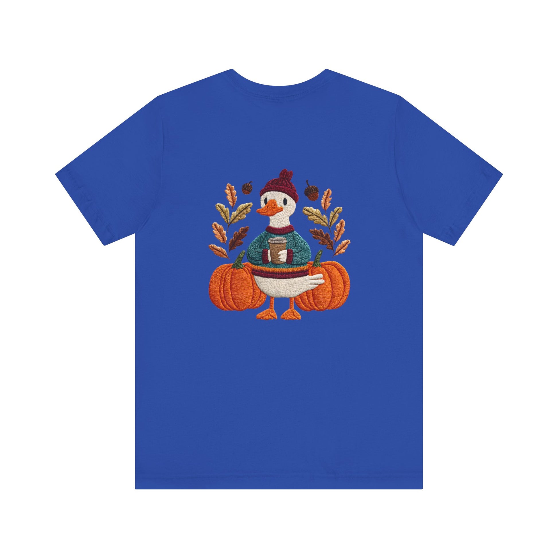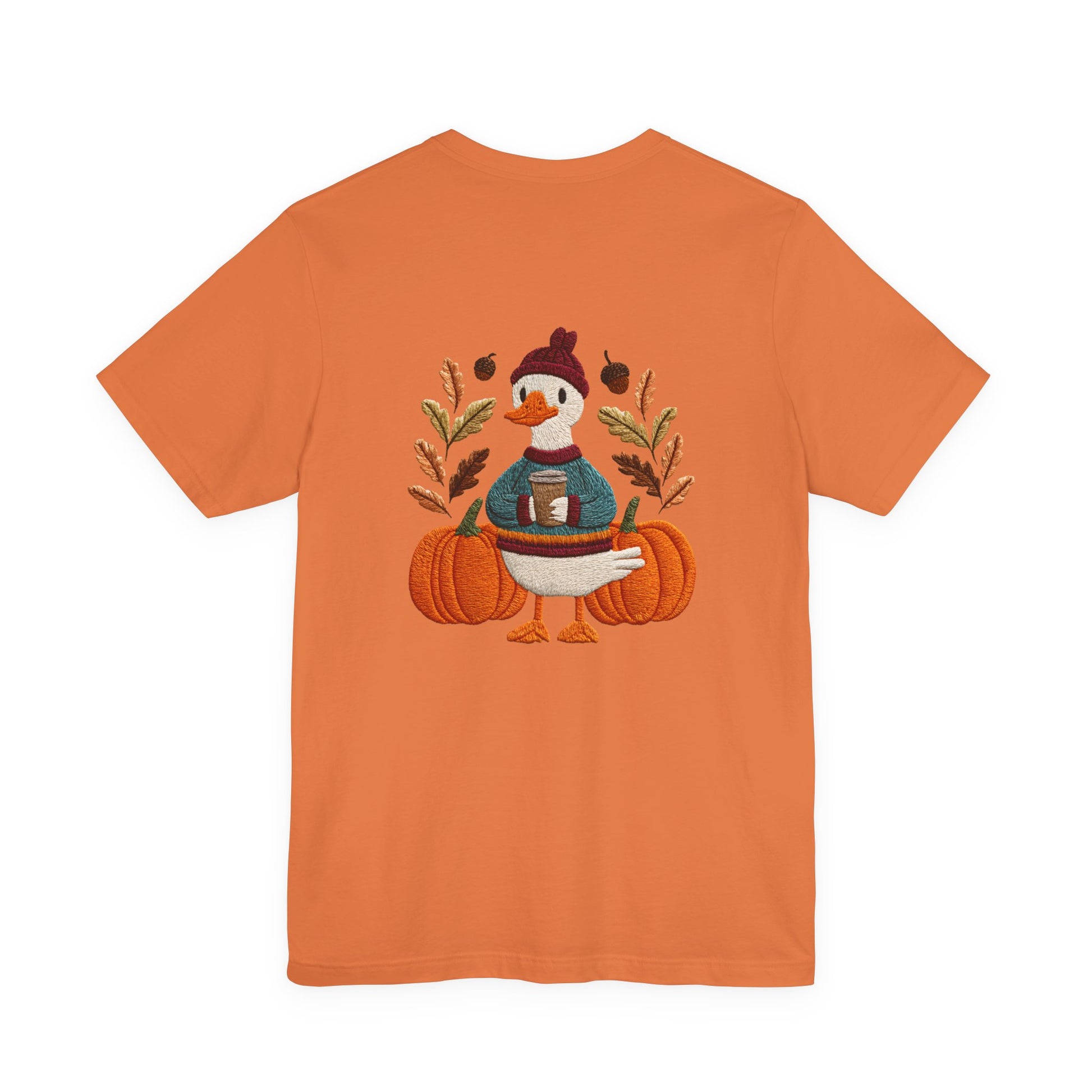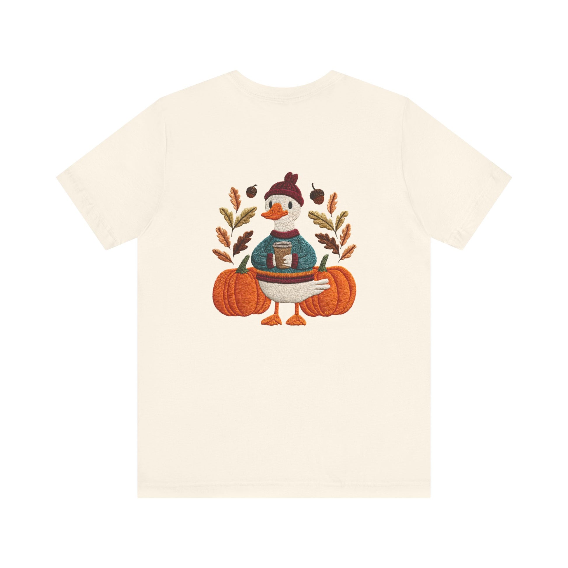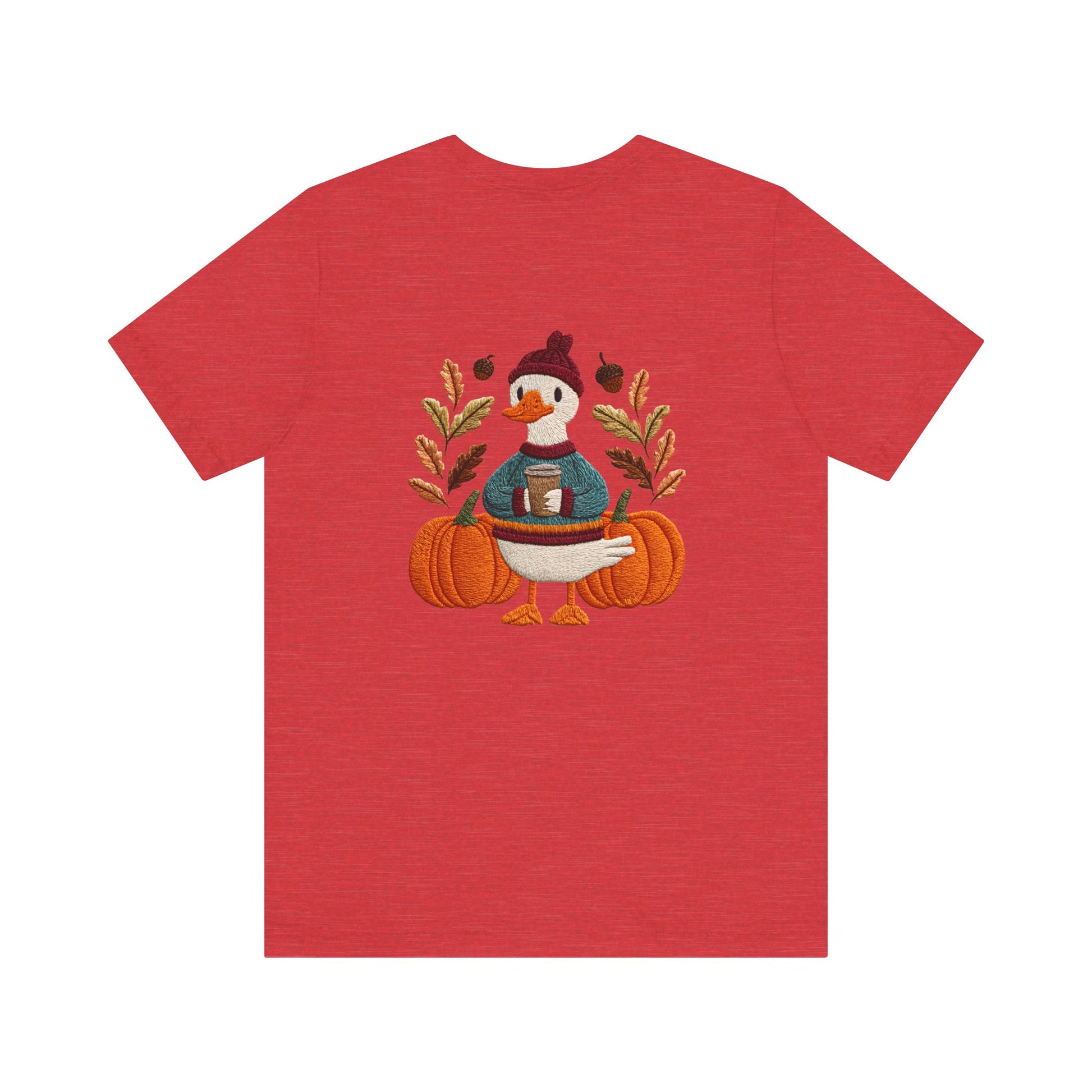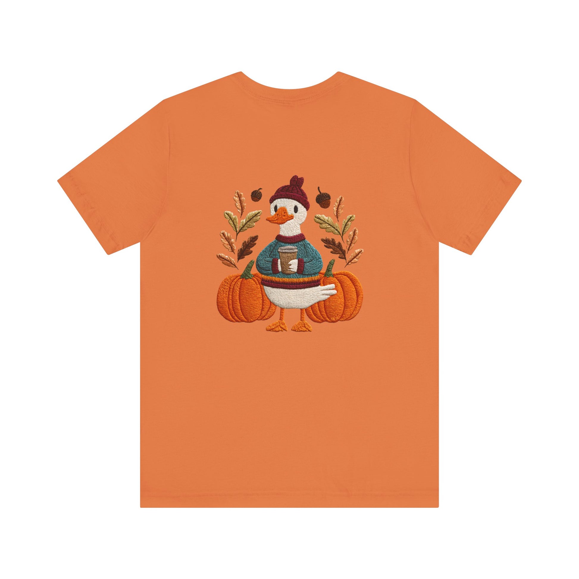 Embrace the cozy vibes of autumn with this stylish Unisex Jersey Short Sleeve Tee! Featuring an adorable design of a cheerful duck surrounded by pumpkins and warm foliage, this tee is perfect for those looking to add a playful touch to their fall wardrobe. Made from soft, breathable fabric, it’s ideal for layering or wearing on its own during casual outings or festive gatherings. Whether you're sipping pumpkin spice lattes or enjoying Halloween festivities, this tee makes a wonderful gift for friends and family who love the season. Great for casual get-togethers, Thanksgiving celebrations, or simply a day at home, it’s a must-have for anyone who enjoys a blend of comfort and style in their casual wear.
