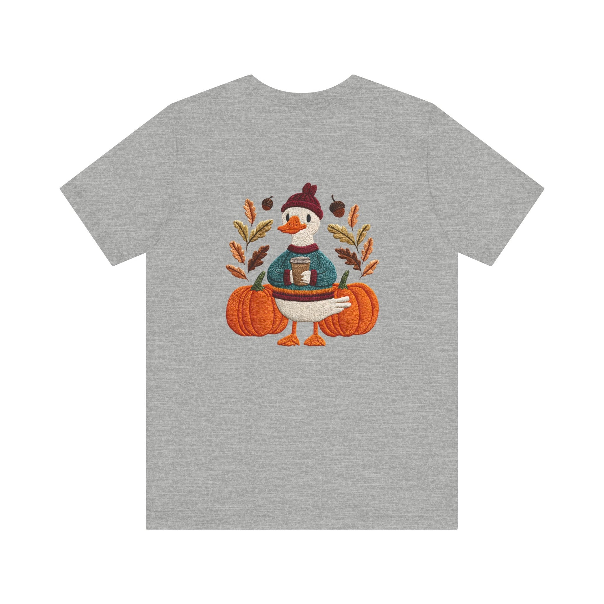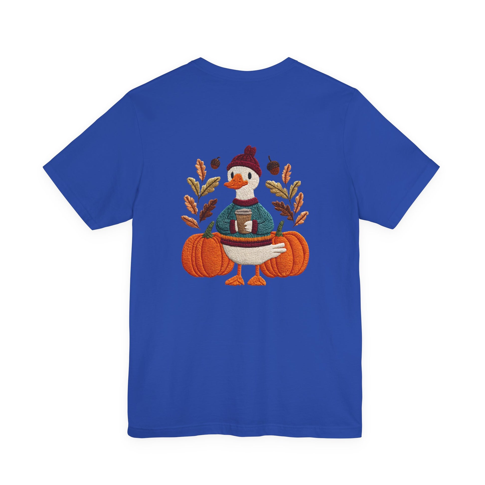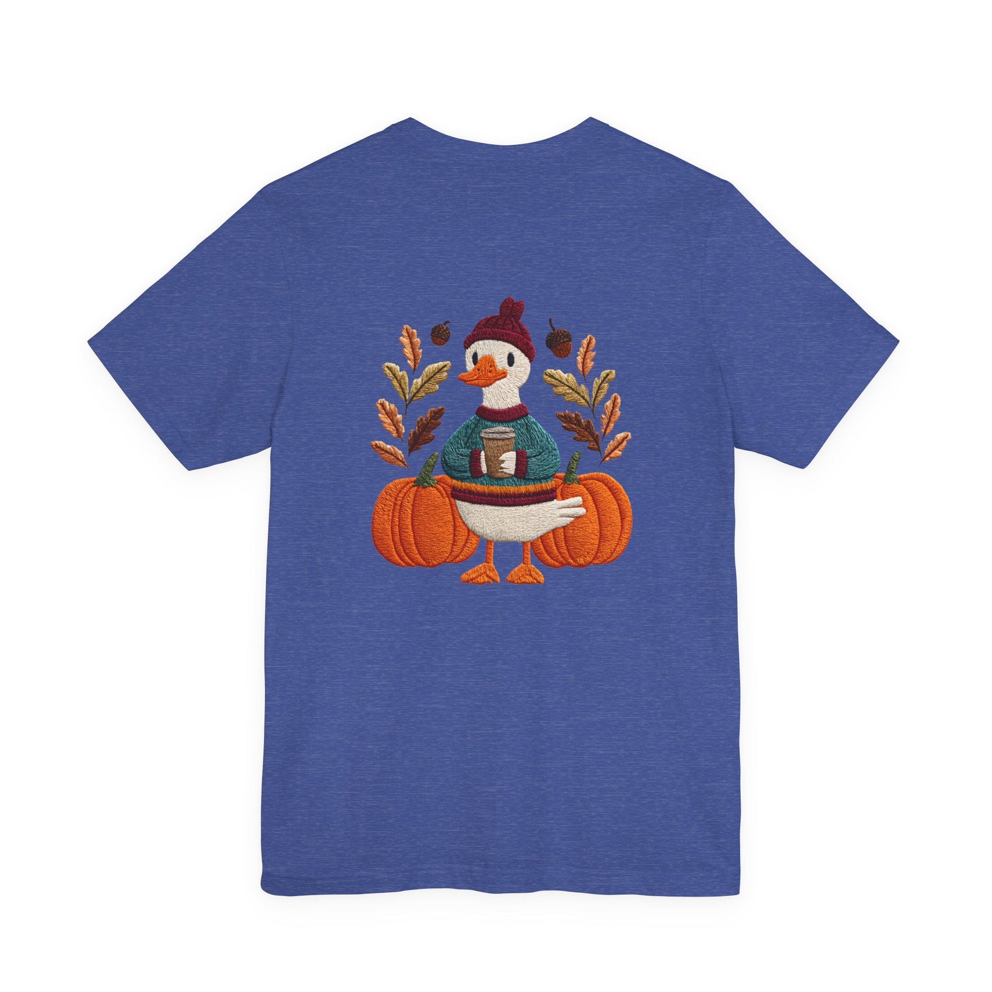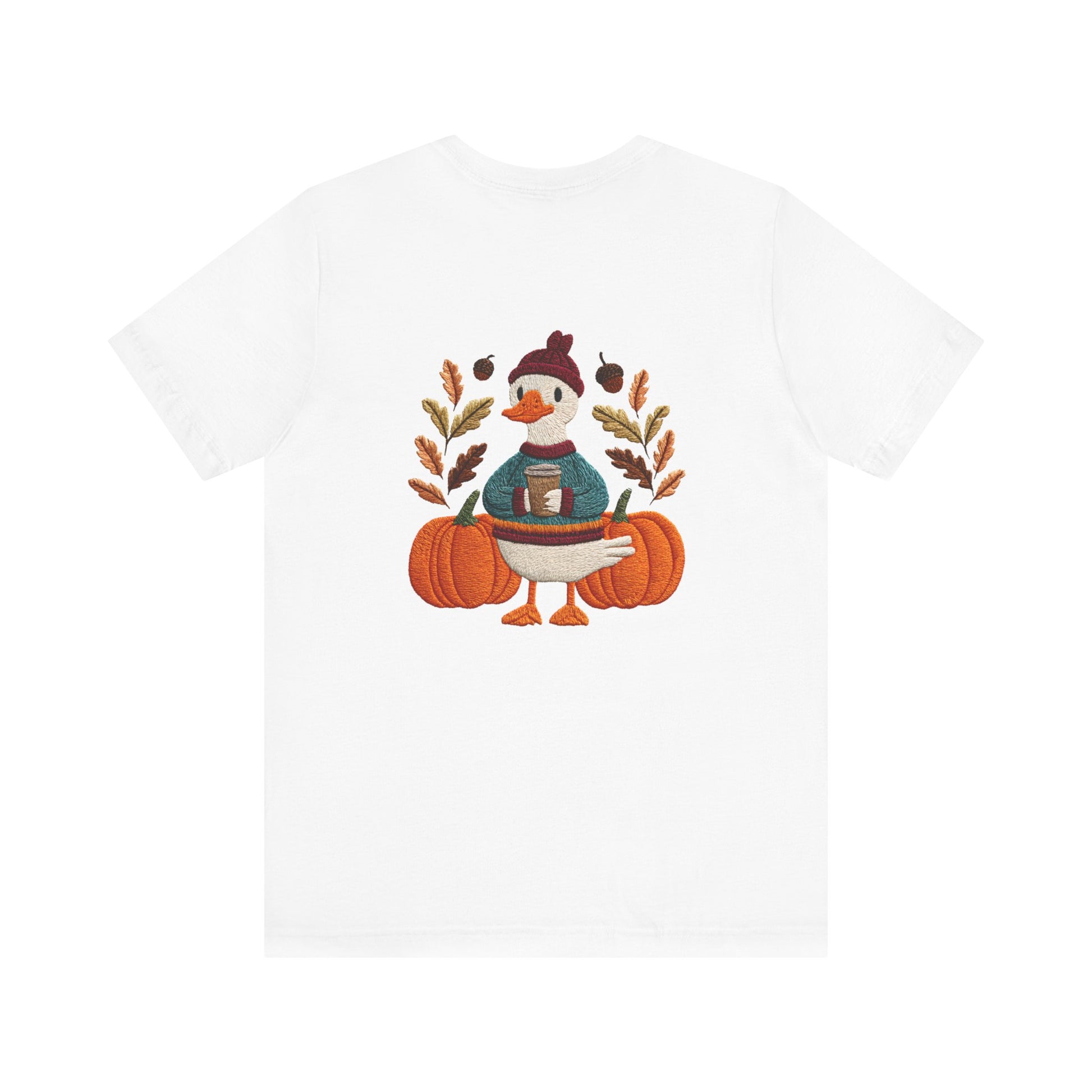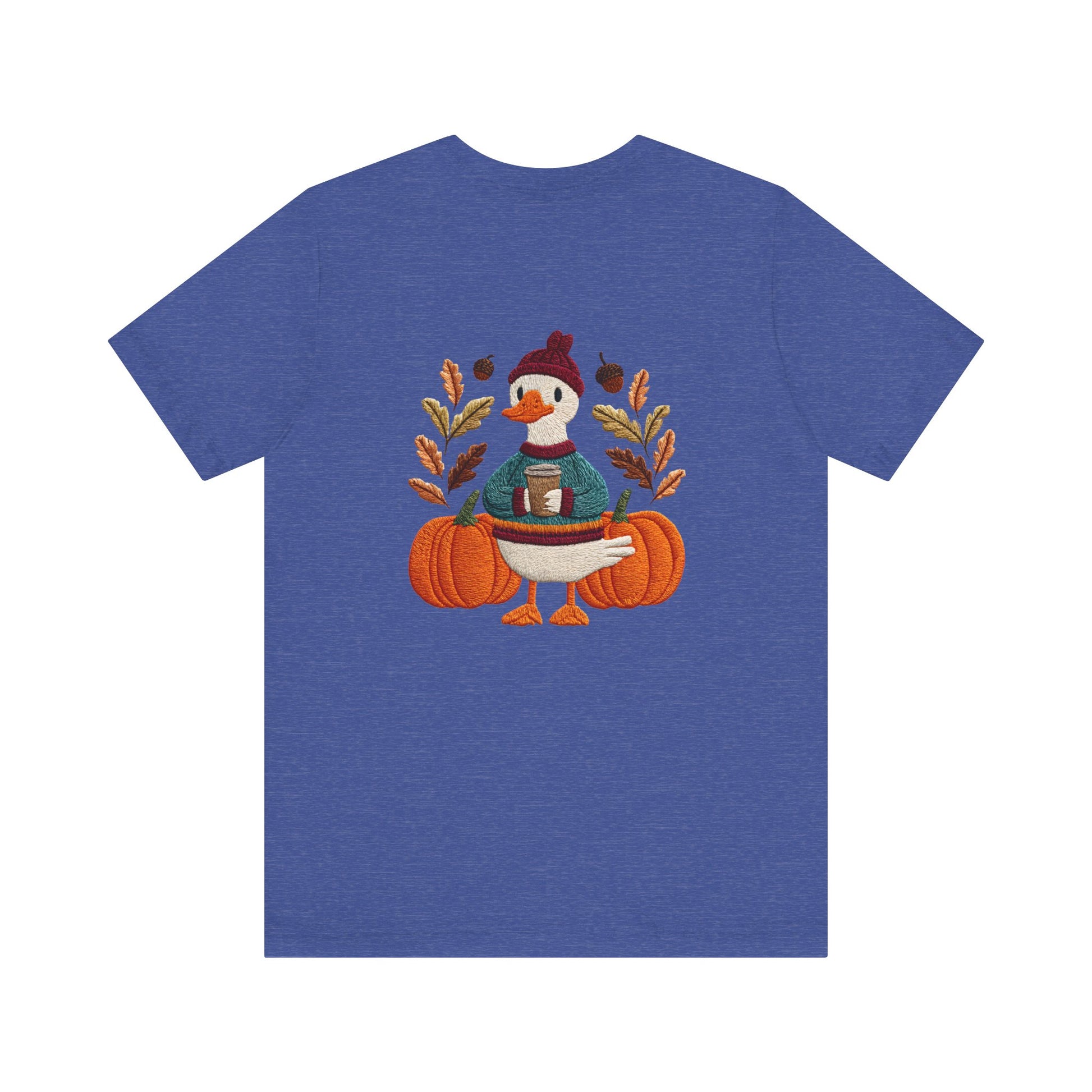 Embrace the cozy vibes of autumn with this stylish Unisex Jersey Short Sleeve Tee! Featuring an adorable design of a cheerful duck surrounded by pumpkins and warm foliage, this tee is perfect for those looking to add a playful touch to their fall wardrobe. Made from soft, breathable fabric, it’s ideal for layering or wearing on its own during casual outings or festive gatherings. Whether you're sipping pumpkin spice lattes or enjoying Halloween festivities, this tee makes a wonderful gift for friends and family who love the season. Great for casual get-togethers, Thanksgiving celebrations, or simply a day at home, it’s a must-have for anyone who enjoys a blend of comfort and style in their casual wear.