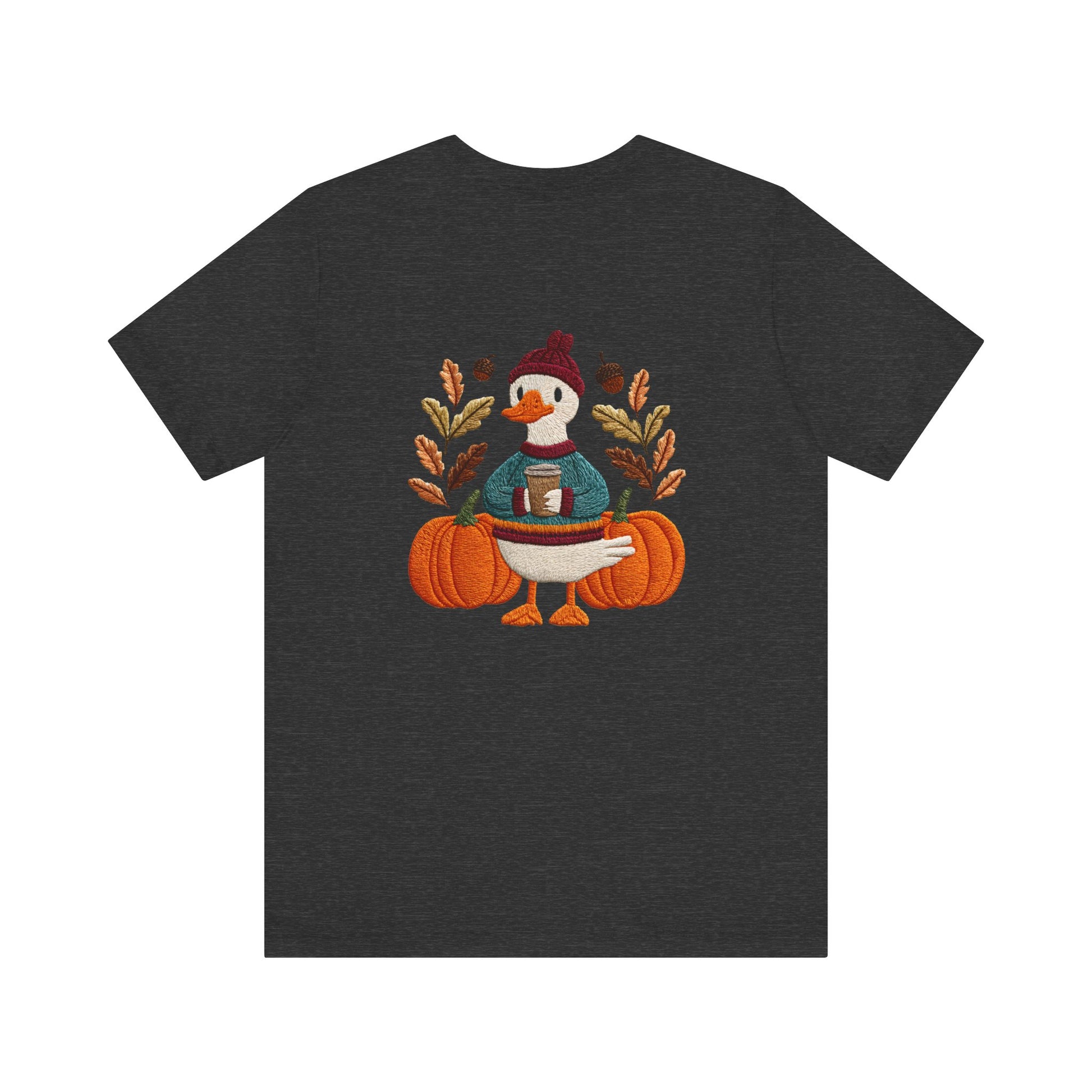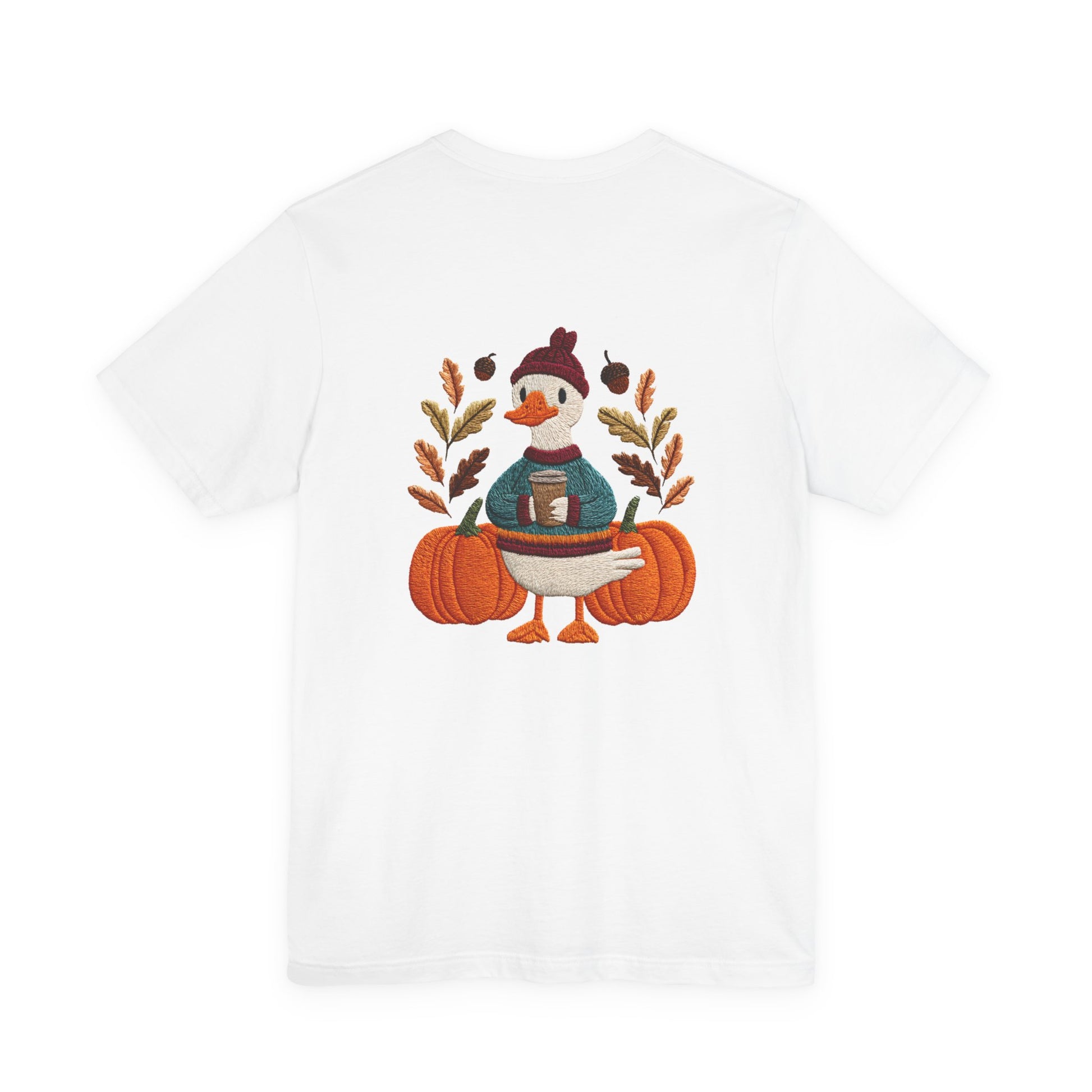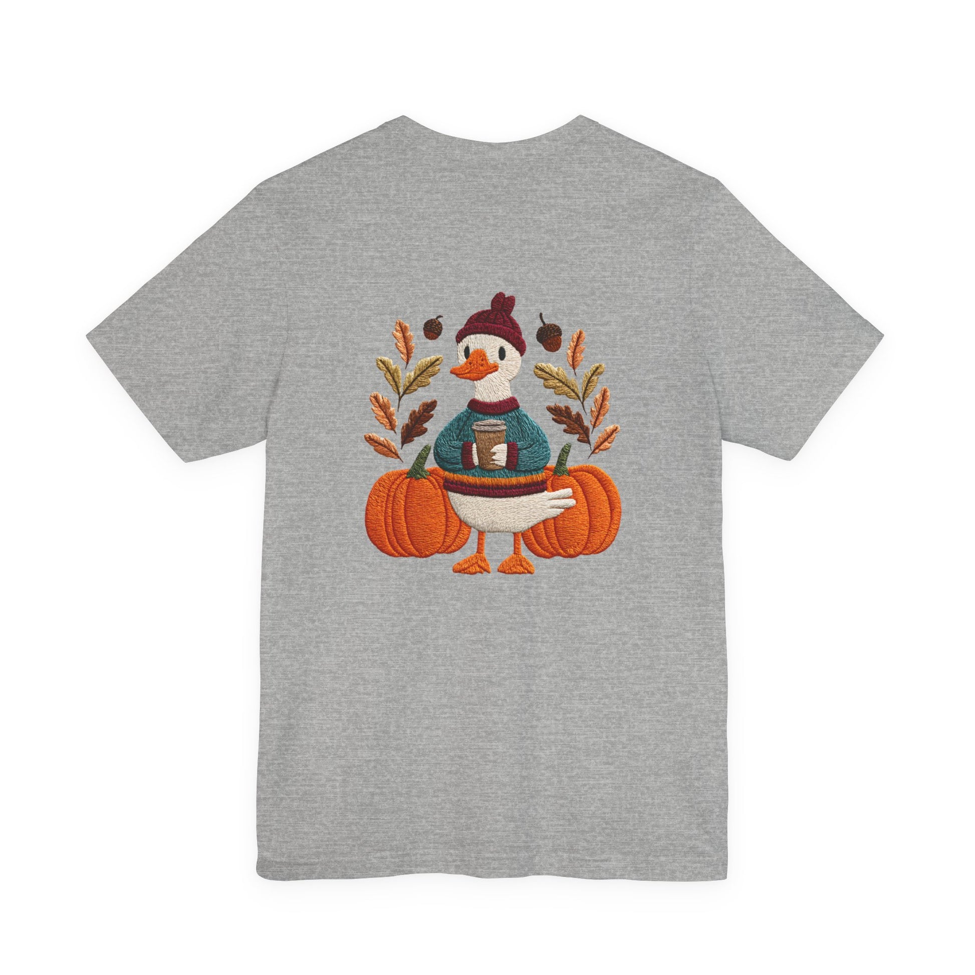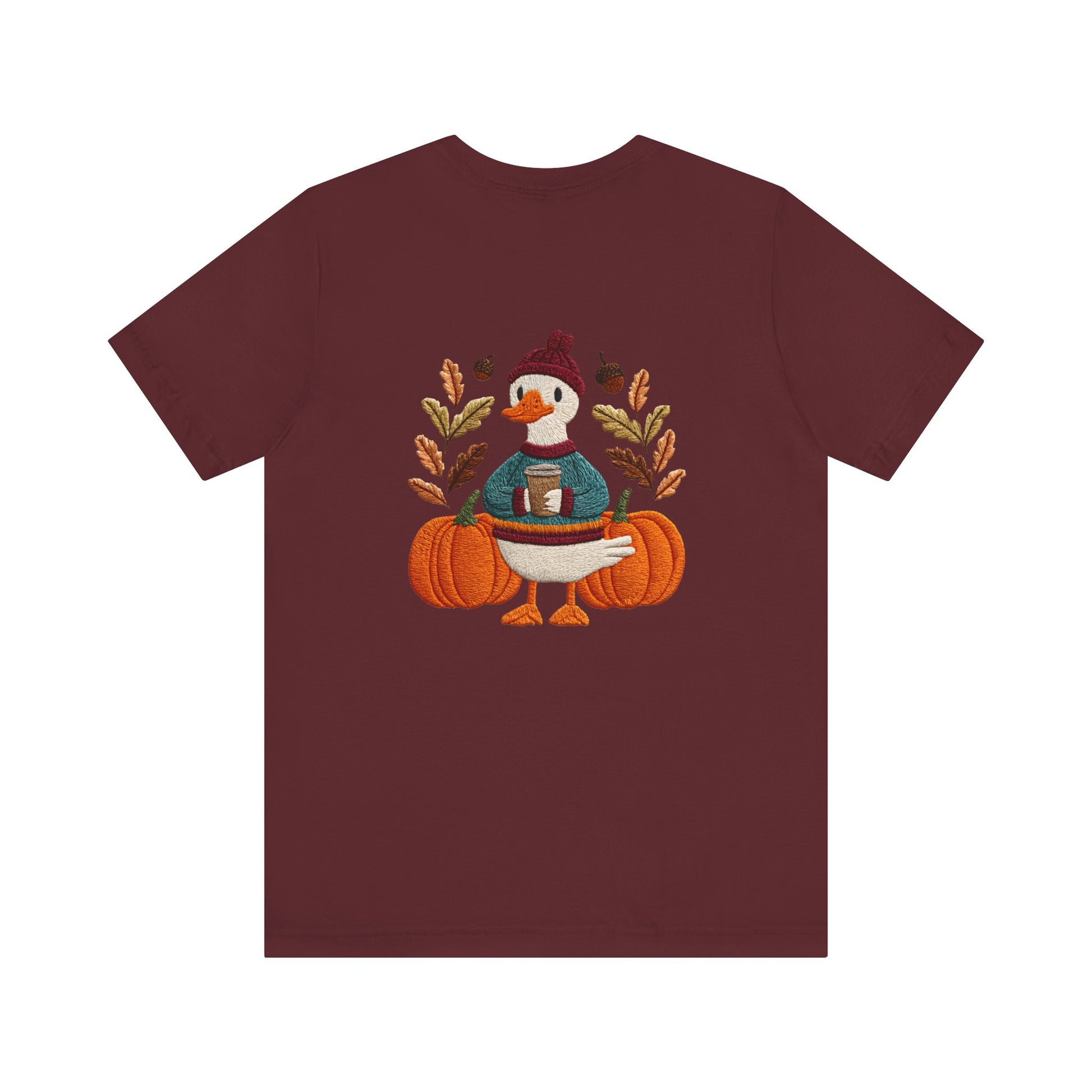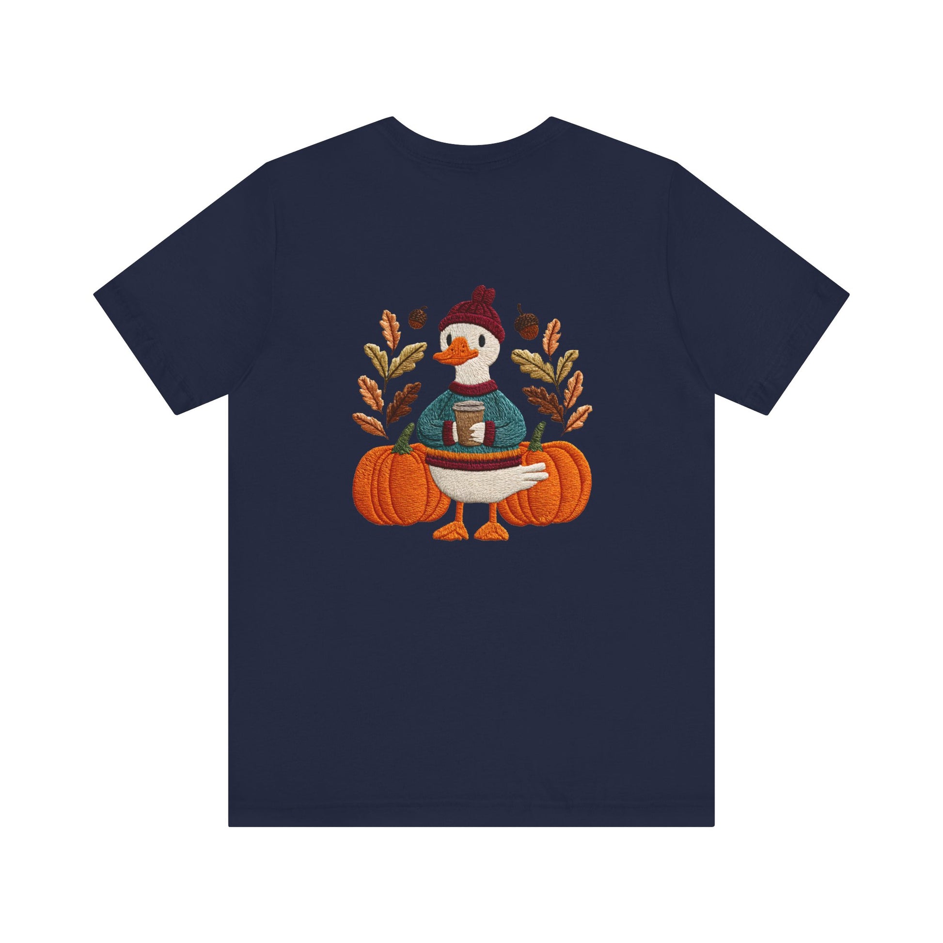 Embrace the cozy vibes of autumn with this stylish Unisex Jersey Short Sleeve Tee! Featuring an adorable design of a cheerful duck surrounded by pumpkins and warm foliage, this tee is perfect for those looking to add a playful touch to their fall wardrobe. Made from soft, breathable fabric, it’s ideal for layering or wearing on its own during casual outings or festive gatherings. Whether you're sipping pumpkin spice lattes or enjoying Halloween festivities, this tee makes a wonderful gift for friends and family who love the season. Great for casual get-togethers, Thanksgiving celebrations, or simply a day at home, it’s a must-have for anyone who enjoys a blend of comfort and style in their casual wear.