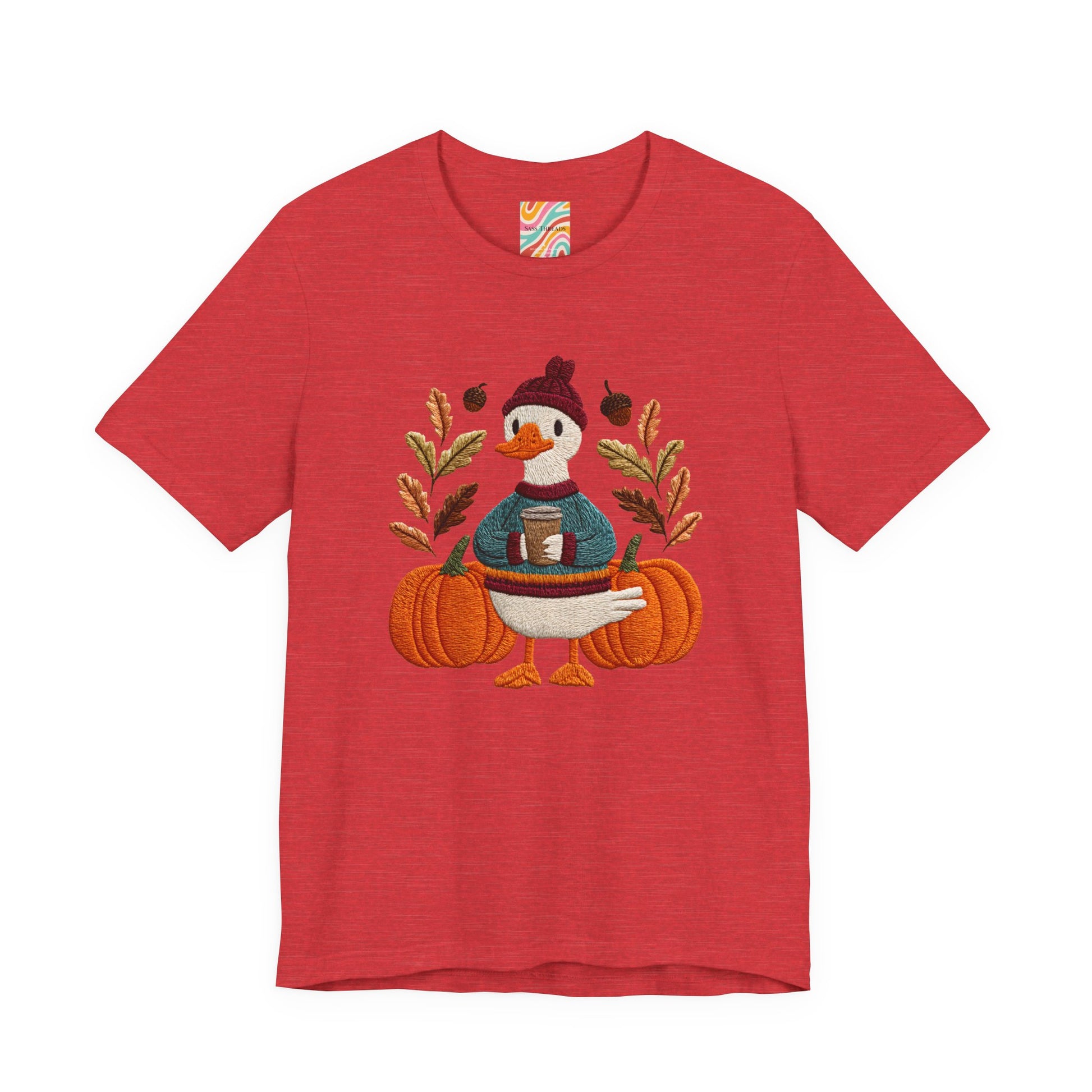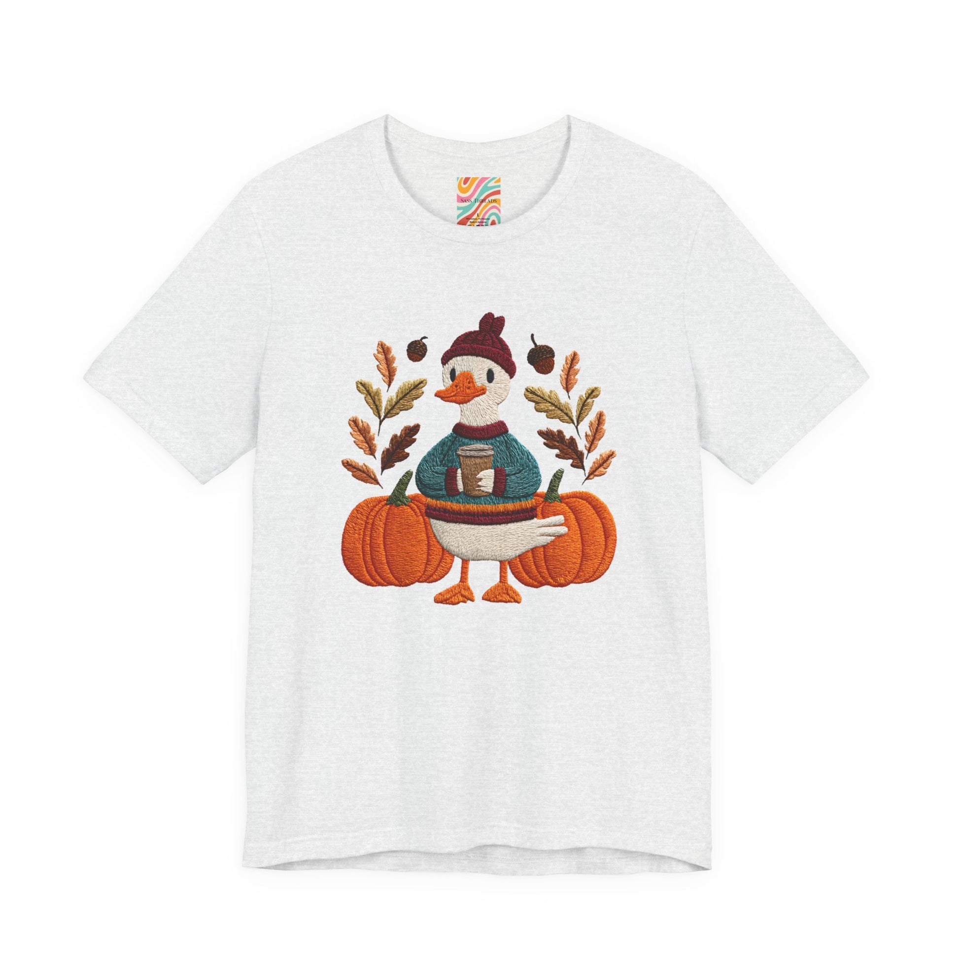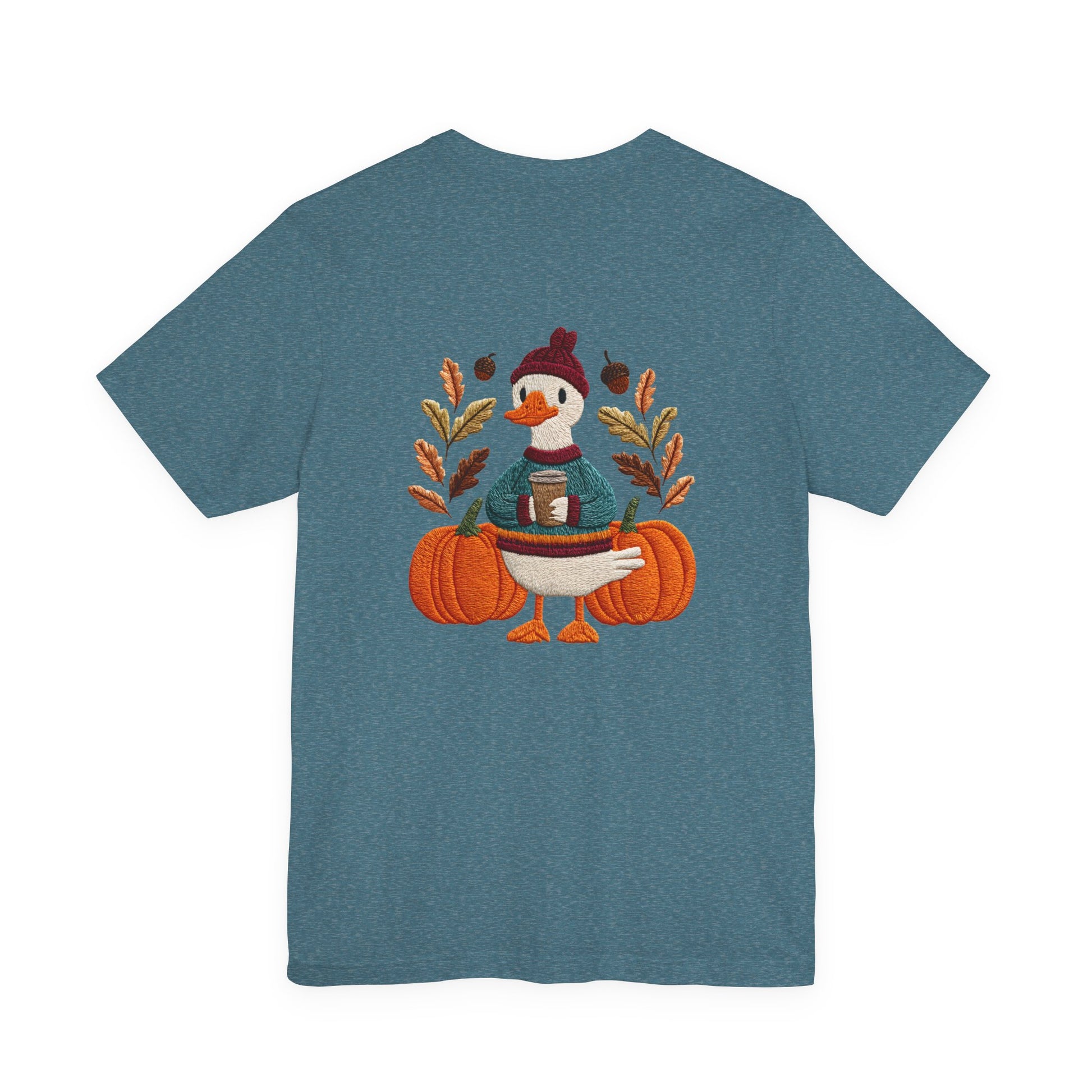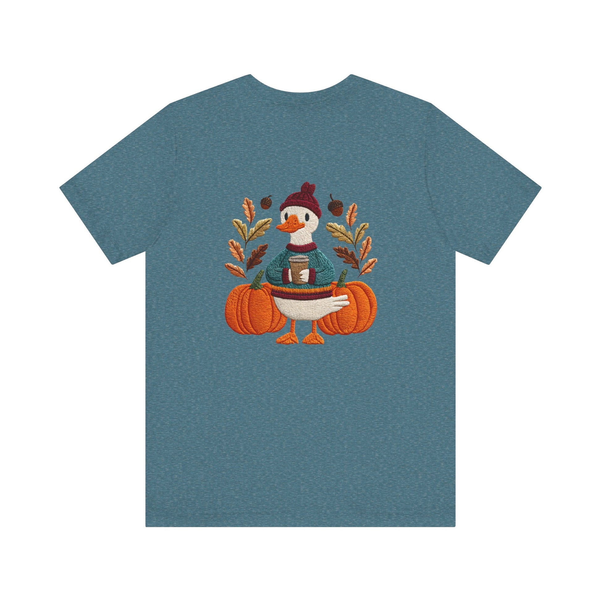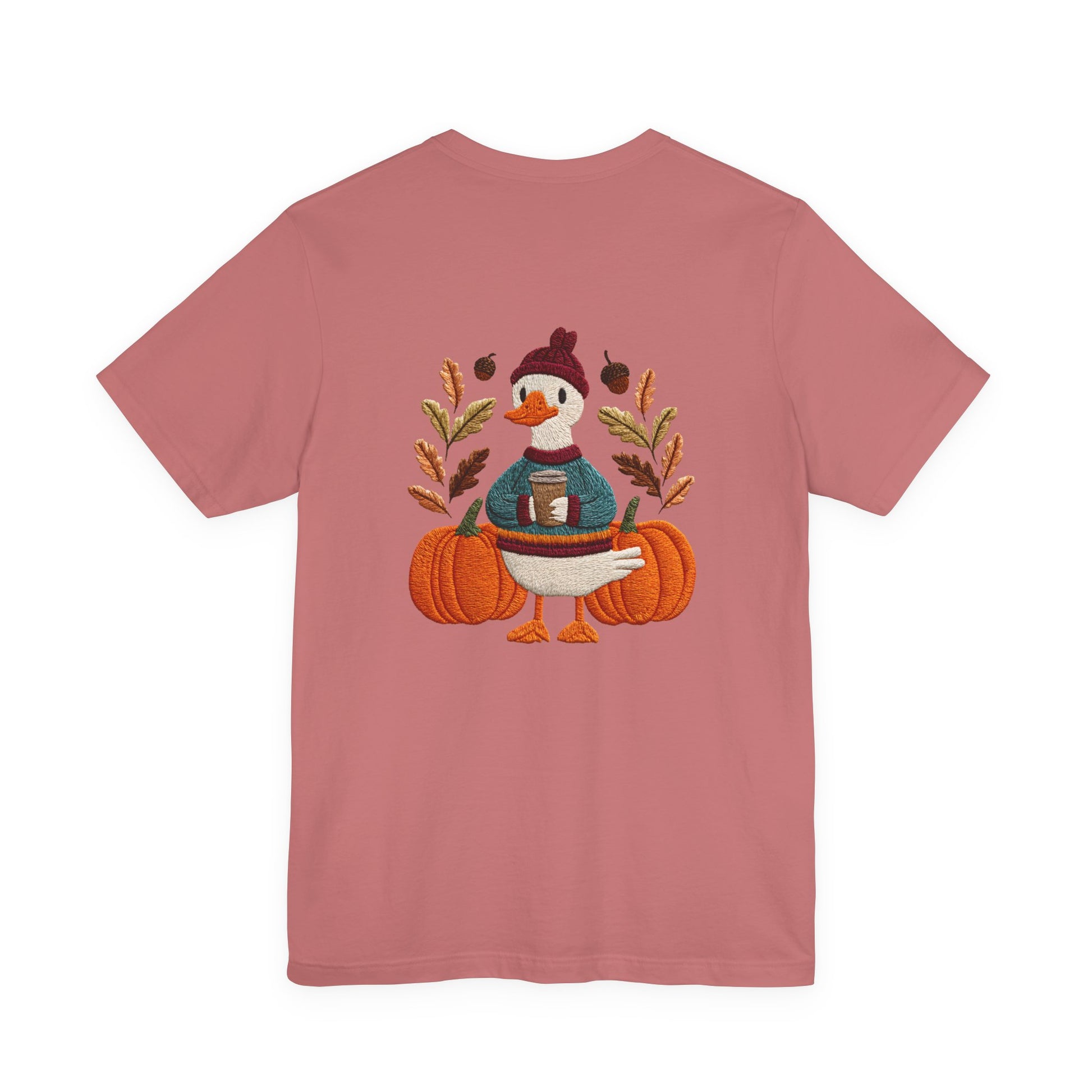 Embrace the cozy vibes of autumn with this stylish Unisex Jersey Short Sleeve Tee! Featuring an adorable design of a cheerful duck surrounded by pumpkins and warm foliage, this tee is perfect for those looking to add a playful touch to their fall wardrobe. Made from soft, breathable fabric, it’s ideal for layering or wearing on its own during casual outings or festive gatherings. Whether you're sipping pumpkin spice lattes or enjoying Halloween festivities, this tee makes a wonderful gift for friends and family who love the season. Great for casual get-togethers, Thanksgiving celebrations, or simply a day at home, it’s a must-have for anyone who enjoys a blend of comfort and style in their casual wear.