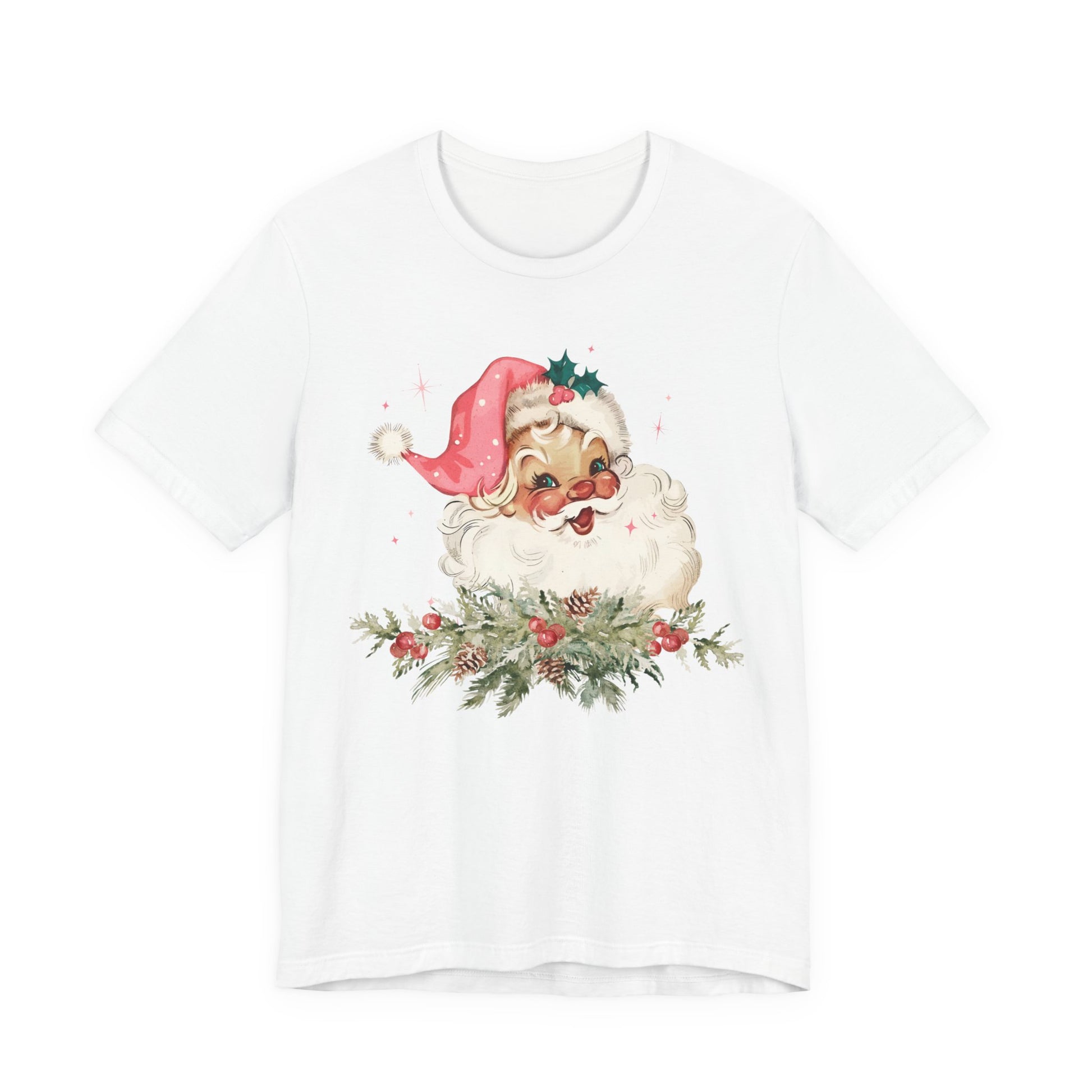 Bring timeless holiday joy to your wardrobe with this Vintage Santa Christmas Tee! Featuring a nostalgic Santa Claus in a charming pink hat surrounded by holly and pine, this retro-inspired design adds a playful, classic touch to your seasonal style.